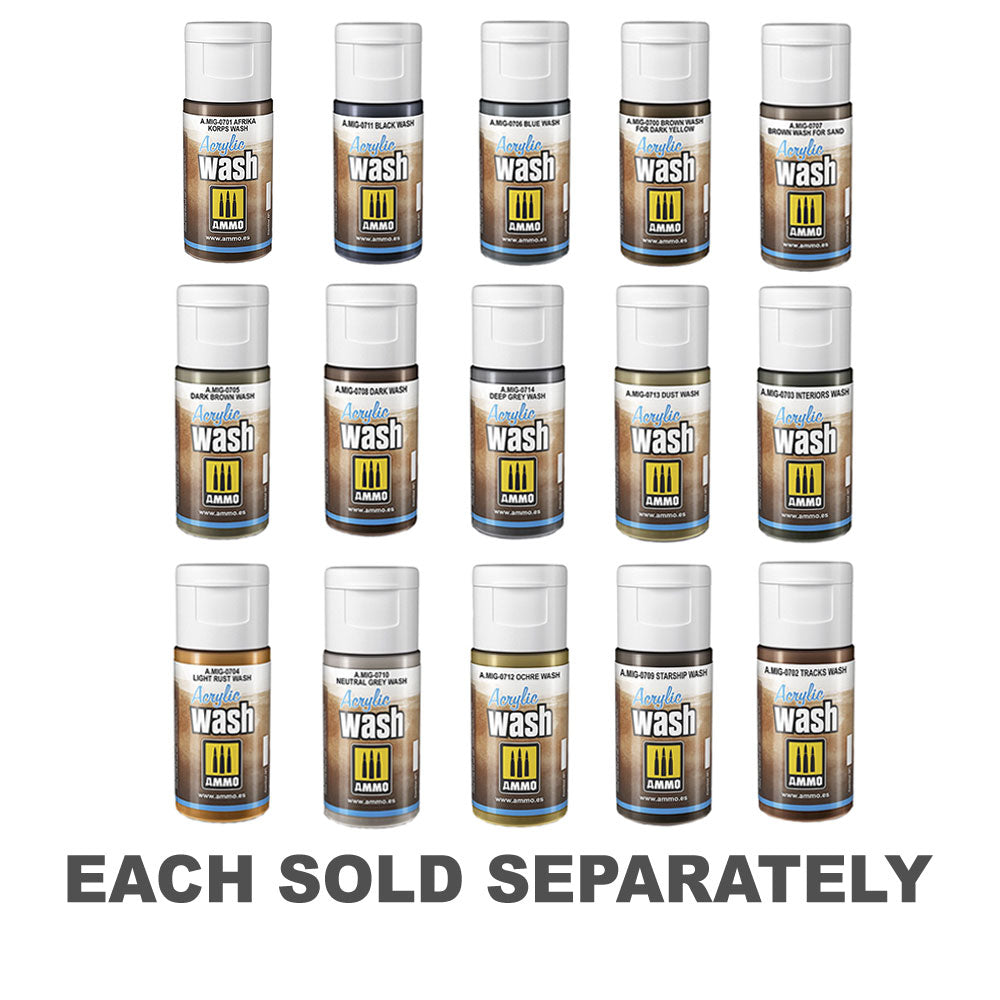 Washes are one of the oldest and most essential modelling techniques, used by all modellers on subjects and dioramas of all types and themes. Developed with two different formulations to include both enamel type and acrylic type. Each type features different qualities to adapt to the variety of needs of our models and the preferences of each modeler demand. Both offer excellent results and are very easy to apply. The advantage of the acrylic wash is that it has no toxicity or odour so using it at home or near your family is not a problem, and it dries faster than the enamel wash which allows you to finish the process in a shorter amount of valued time. The acrylic wash comes in a bottle with a dosing cap that allows you to place a few drops on a palette or container for later use. Although the capacity of the bottle is 15 mL, the dispenser allows you to save product and work with more precision. These new washes come in a wide range of colors so you can have all the options for your