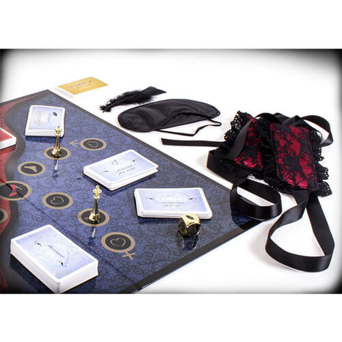 - What’s in the box: 252 cards; game board; 2 metal pawns; metal dice; stylish handcuffs; blindfold; whip; feather; scented candle; rose petals; rulebook