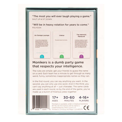 Monikers is a party game based on the public domain game Celebrity, where players take turns attempting to get their teammates to guess names by describing or imitating well-known people.