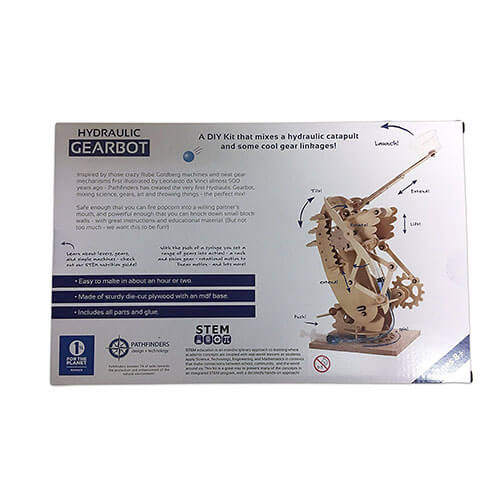 Hydraulic Gearbots are not all that common, but the fun thing about this one is that it is relatively easy to make and will amaze your friends. Inspired by those crazy Rube Goldberg machines and neat gear mechanisms first illustrated by Leonardo da Vinci almost 500 years ago, Pathfinders has created the very first Hydraulic Gearbot. Mixing science, gears, art and throwing things - the perfect mix! Assembled size 33 x 66cm, 13 x 18 inches