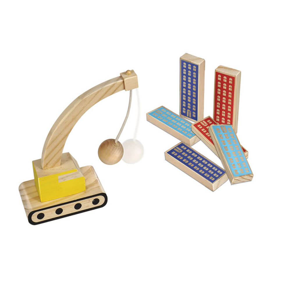 - This set includes 6 wooden buildings and 1 wrecking ball.