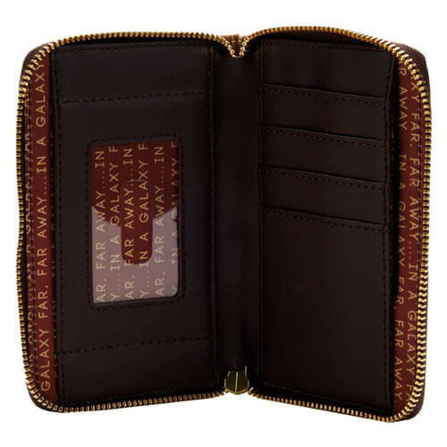 • The Loungefly Star Wars Lands Jakku Zip Around Wallet is made of vegan leather (polyurethane).Wallet zips closed with sturdy metal hardware and features printed details.Take note of the coordinating inside lining.