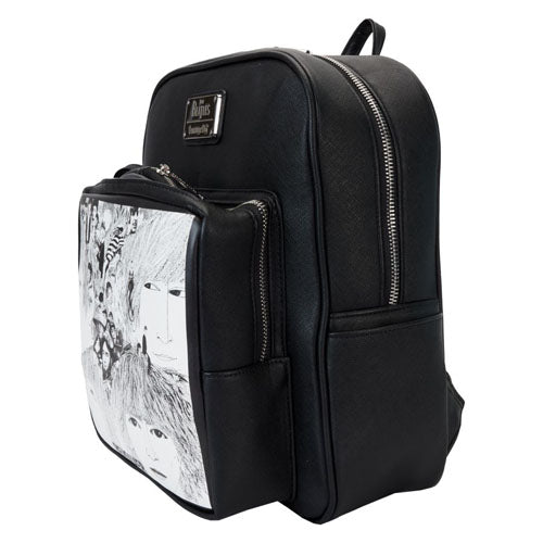Put a noteworthy spin on your look with our Loungefly The Beatles Revolver Album with Record Coin Purse Mini Backpack. This stylish backpack features the cover art from the album on the front pocket. The printed artwork reflects the iconic black-and-white drawings and collages of the original cover. Just behind the front pocket, there's a slot where you can store a record-shaped coin purse, which also includes the front cover art in the center. On the back, the word "Revolver" appears in white print. Secure just what you need for the day and capture a memorable Beatles moment to harmonize with any outfit.
