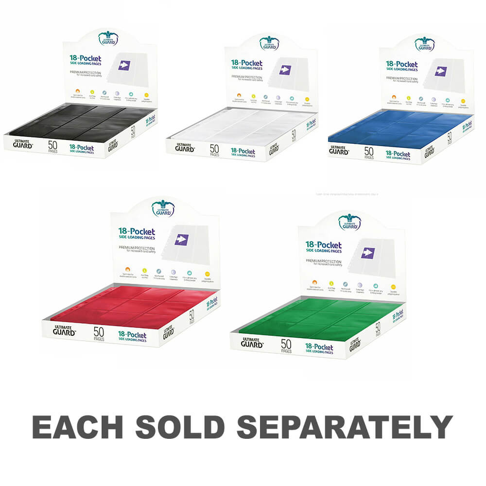 High-quality, double-sided pocket pages (9 pockets on each side), that fit in almost any D-Ring-Binder, for storing and displaying up to 18 double-sleeved cards per page. 50 pages per pack.