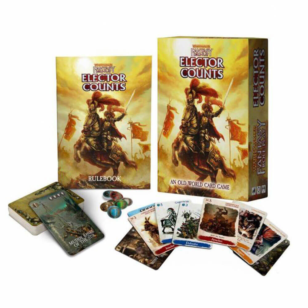 Fight for control of The Empire We are delighted to announce an exciting new Warhammer Fantasy Roleplay card game for 2-4 players, Elector Counts contains everything you need to vie for control of the Empire. This box contains a set of English rules, 112 game cards, a set of tokens and a player aid card. Designed to mimic the card games enjoyed by ruffians, gamblers and adventurers in inns and taverns across the Empire, Elector Counts is the perfect companion game to enjoy between your adventures in the Old World. The cards are gloriously illustrated in art new and old, with iconic pieces joining novel depictions of the loyal soldiers, iconic locations and famous personages of the Empire.