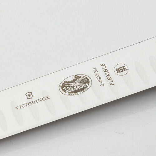 Couteau de saumon Victorinox Fibrox avec une lame flexible et une poignée ergonomique non glissée. Couteau ultrasque avec un bord cannelé pour trancher le saumon et les poissons gras en morceaux fins. Swiss a fait que la lame mince est très flexible, donc excellente pour le filet. Le bord cannelé des deux côtés signifie que vous pouvez couper extrêmement près de l'os et trancher avec une dextérité super fine.