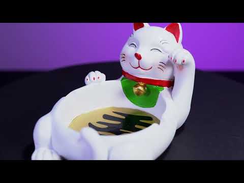 • Le chat est conçu dans une couleur blanche traditionnelle et porte un bavoir vert et une cloche dorée
