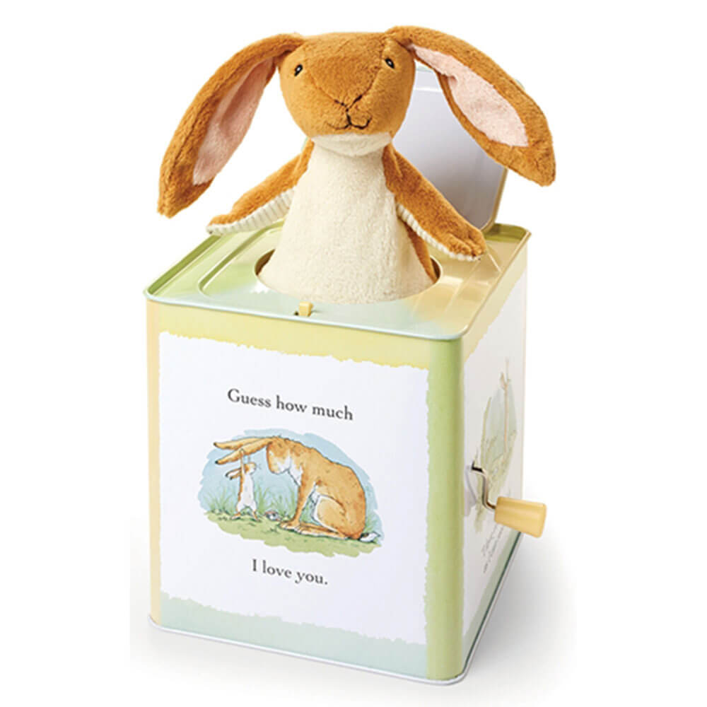 Ce Jack-in-the-Box traditionnel présente des images et des phrases en surbrillance du livre très apprécié "Devinez combien je t'aime". Au fur et à mesure que vous remontez la poignée, « Pop Goes the Weasel » joue, puis un petit lièvre brun noisette apparaît ! Convient aux enfants de 6 mois et plus.