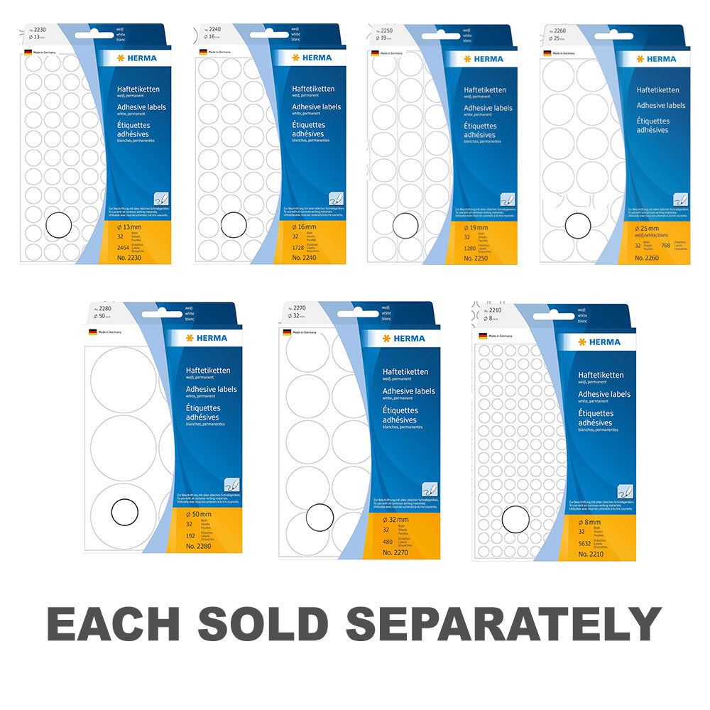 Streamline your labeling tasks with Herma Multi-Purpose Adhesive Dot Labels! This pack includes dot labels in white, offering versatility for a variety of applications such as organizing, filing, or creative projects. With a strong adhesive backing, these dot labels adhere securely to various surfaces, ensuring clear and professional labeling. Whether for small item labeling, marking, or crafting, these multi-purpose adhesive dot labels provide efficiency and convenience for all your labeling needs. Get ready to label with precision using Herma Multi-Purpose Adhesive Dot Labels in white!