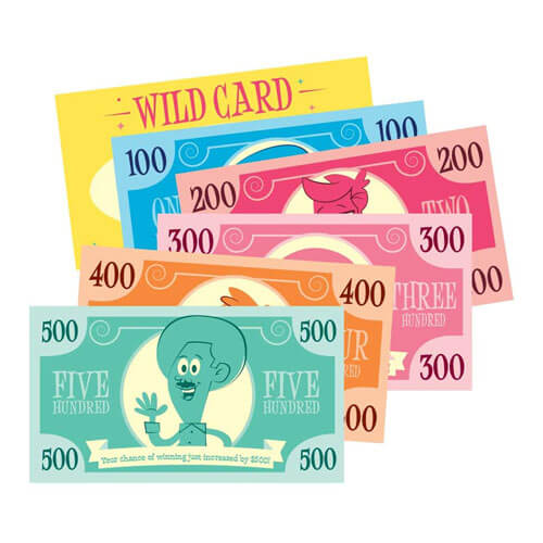 - COMMENT EST-CE-QU'ON JOUE? - À chaque tour, le joueur 1 lit à haute voix l'une des 180 questions amusantes, créatives, personnelles et "chargées". Tous les autres écrivent une réponse personnelle à la question sur leur feuille de réponses. N'importe quelle réponse fera l'affaire ! Le joueur à droite du joueur 1 ramasse, mélange et lit à haute voix les réponses. Le joueur un choisit sa réponse préférée et doit deviner quel joueur a dit quelle réponse. Le joueur 1 récupère une carte d'argent pour chaque match correct. Le joueur qui a écrit la réponse préférée choisit également une carte d'argent. Chaque carte d'argent a une valeur en dollars de 100 $ à 500 $, et les jokers sont mélangés