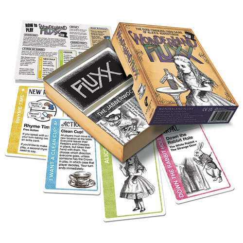 Dans Wonderland Fluxx, vous pouvez descendre dans le trou du lapin pour rejoindre Alice alors qu'elle prend le thé avec le chapelier fou, obtient les instructions du chat du Cheshire, essaie de raisonner avec Tweedle Dee et Tweedle Dum, et grandit et rétrécit de manière alarmante. Vous devrez peut-être même tuer un Jabberwock pour gagner dans cette version encore plus curieuse de Fluxx...