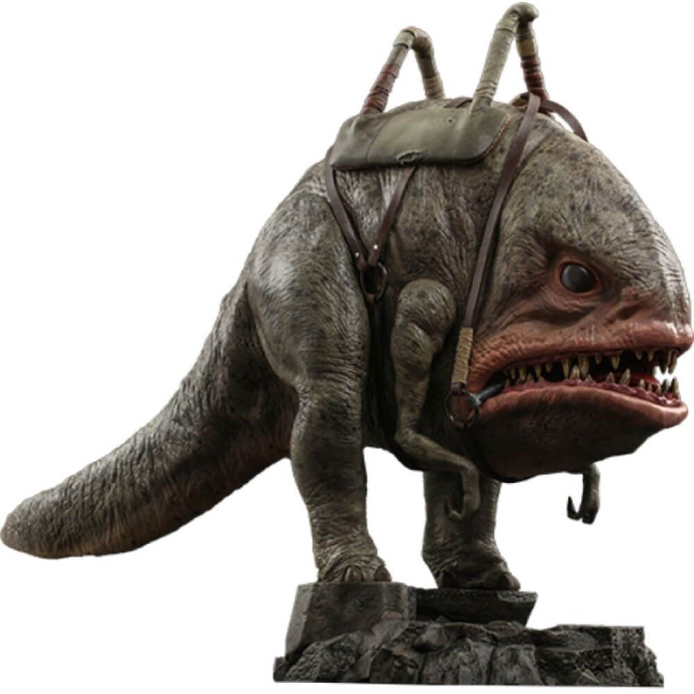 Der hochpräzise Blurrg wurde basierend auf dem Aussehen der Kreatur in The Mandalorian gekonnt entwickelt. Mit einer Höhe von ca. 37 cm (43 cm mit Sockel) und einer Länge von 60 cm verfügt es über einen sehr detaillierten Kopf und Körper, bewegliche Arme, einen Sattel und einen Ausstellungsständer mit Rockmotiv!