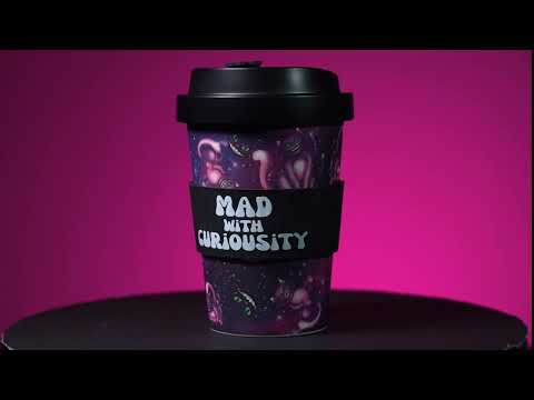Umweltfreundlicher Reisebecher aus Bambus: biologisch abbaubar, BPA-frei, spülmaschinenfest, antibakteriell. Mit winkenden Glückskatzen und fuchsiafarbenen Blumen auf einem leuchtend roten Hintergrund. Passender roter Anti-Auslauf-Deckel und schützendes Silikonband mit „Lucky Kitty“-Schriftzug. Fasst ca. 470 ml