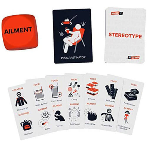 Nailed It ist ein Partyspiel für Erwachsene, in dem die Spieler zuordenbare Stereotypen feiern können, die wir in unserem täglichen Leben sehen. Jeder Spieler erhält 6 Kategoriekarten, um das Spiel zu beginnen. Auf jeder dieser Karten befinden sich Gegenstände aus 4 Kategorien: Ort, Nahrung, Kleidung und Krankheit.