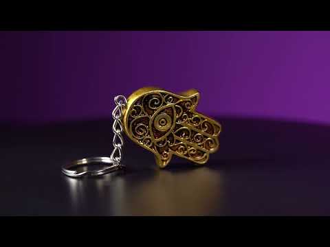 Mystischer handbemalter Hamsa-Hand-Schlüsselanhänger. Verfügt über ein aufwendiges Hamsa-Design mit Metallic-Finish auf einem traditionellen Schlüsselanhänger.