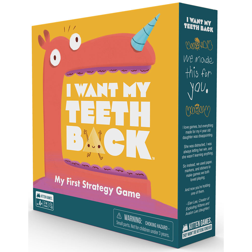 • Ich will meine Zähne zurück. Spielinhalt: Nehmen Sie an dem zahngeilen Abenteuer mit 1 Spinner, 1 Landematte, 4 Meefs, 57 Karten, 1 Menükarte und 60 Zahnmarkern teil. Dieses aufregende Kartensammelspiel ist vollgepackt mit allem, was Sie für endlosen Spielspaß brauchen. Drehen Sie den Spinner, navigieren Sie auf der Landematte und begeben Sie sich auf eine spannende Suche nach Meefs verlorenen Zähnen! Mit einer großen Auswahl an Komponenten bietet dieses Spiel stundenlange Unterhaltung und Spannung für Spieler jeden Alters.