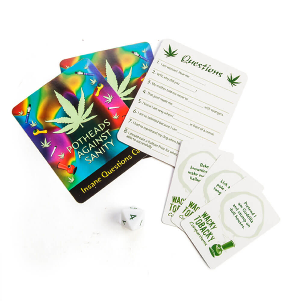 - 96 verrückte Fragen und 107 verrückte Antwortkarten: ein 8-seitiger Würfel und eine Regelkarte