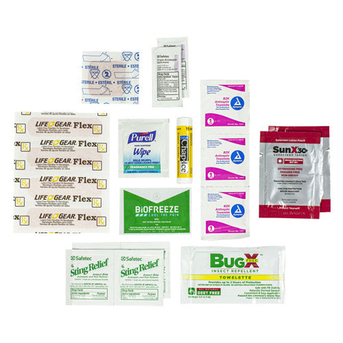 16 -teiliges Lebensgespräch im Freien im Freien umfasst 4 x Flex -Fit -Bandagen, 1 x Blisterbandage, 2 x Antibiotika -Salben, 3 x antiseptische Wischtücher, 1 x antimikrobielles Wisch x sunx sunscreen spf 30
