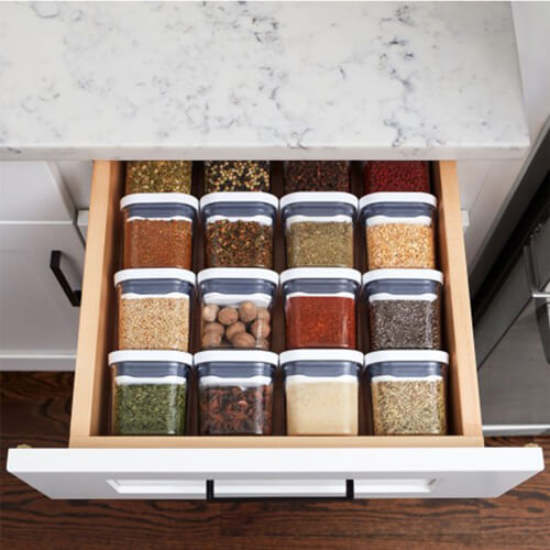 < li>Drücken Sie den Knopf, um den luftdichten Verschluss zu aktivieren. Der Knopf dient gleichzeitig als Griff für den Deckel. - Verwenden Sie die Mini-POP-Behälter überall dort, wo Sie Organisation wünschen: Schreibtischschubladen, Schubladen, Badezimmer oder Spielzimmer