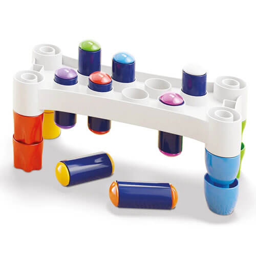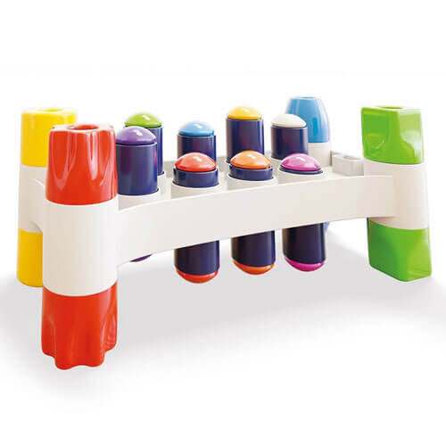 • Viel Spaß beim Schlagen der bunten Stifte mit dem Hammer und wenn Sie fertig sind, stellen Sie das Spiel auf den Kopf und beginnen Sie erneut.