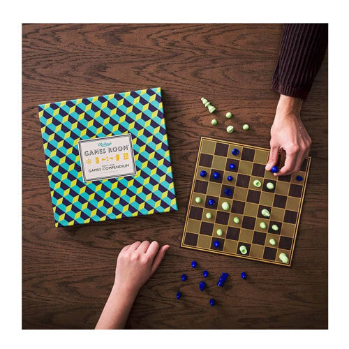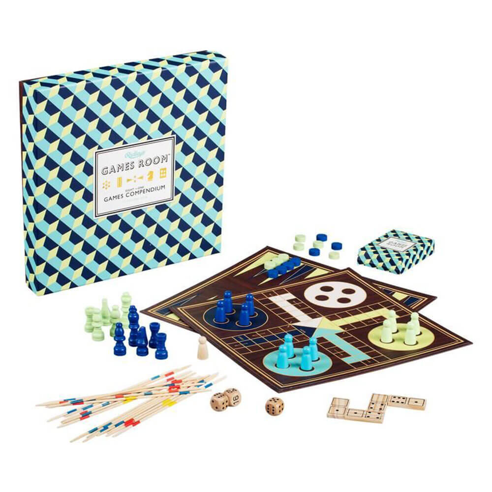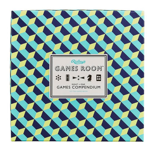 Verbringen Sie einen klassischen Spieleabend mit diesem Spielekompendium von Ridley's Games! Acht-in-Eins-Spiele-Kompendium. Verpackt in einer Schachtel mit geometrischem Druck. Enthält Backgammon, Schach, Dame, Dominosteine, Dame/Dame, Ludo, Pick-up Sticks, Spielkarten und Anleitung.